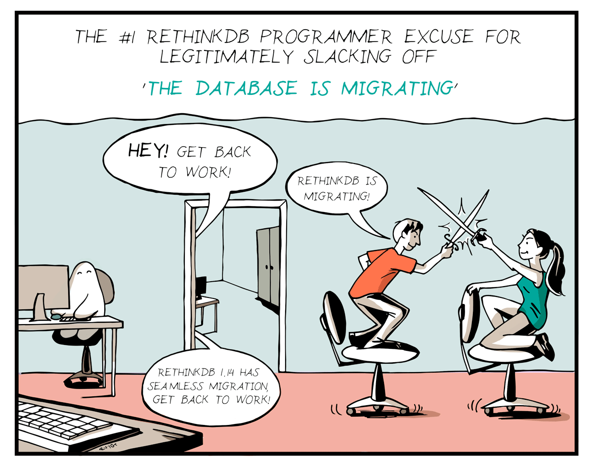 1.14 is the first RethinkDB release that doesn’t require you to migrate your data. Just upgrade the package and restart your RethinkDB processes. Your 1.14 cluster will be ready to go immediately after restarting! This is something people have been asking for since our first release, and we’re happy to finally be able to provide it. Making upgrades easier is a big step towards production readiness.