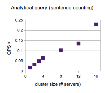 With a single server, our query takes 59 seconds to complete. The automatic query parallelization in RethinkDB results in practically linear scalability, as the same query is executed in just above 4 seconds on 16 servers. The graph, shown in the results overview section, demonstrates the inverse execution time (queries per second) of the query.