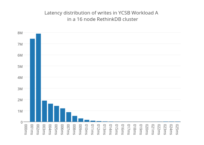 This report describes a recent effort that the RethinkDB team took to measure our database product, RethinkDB, under different workloads and in different clustering configurations. We seek to provide a general overview of RethinkDB’s performance metrics for a variety of workloads and potential use cases. In this report some of the questions we’ll address include: