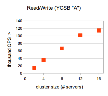 RethinkDB achieves a throughput of 14.6K QPS with two servers, and scales near-linearly as servers are added to the cluster.