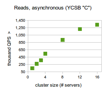 RethinkDB demonstrates extremely high scalability in this configuration, reaching throughputs of well over a million queries per second. The slightly sub-linear scalability when going from 12 to 16 database servers is caused by the client servers’ CPUs getting saturated at these throughputs.