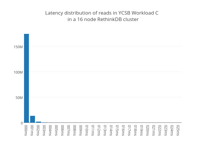 In terms of latency, we found that in a 16-node cluster and forbidding stale reads, the 95th percentile for latency is 3ms. When doing a heavy read workload, a large majority of reads fell between 0ms and 1ms which can be seen in the graph below.