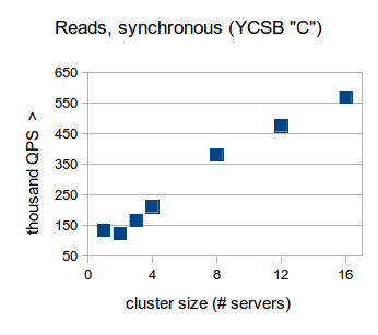 We first tested this workload in the default configuration for RethinkDB which forbids stale reads. In this configuration, RethinkDB is able to perform 134.7K QPS on a single server. While the overhead of network communication between the servers becomes visible when increasing the cluster size from one to two servers, adding further servers to the cluster demonstrates the near-linear scalability of RethinkDB, up to over 500K QPS on 16 servers.